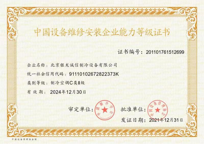 2007年:獲準(zhǔn)成為北京市制冷行業(yè)技術(shù)學(xué)會理事單位; 2009年:獲得北京市大興區(qū)百強(qiáng)企業(yè)認(rèn)證; 2009年:獲得國家高新技術(shù)企業(yè)認(rèn)證; 2011年:獲北京市安全生產(chǎn)先進(jìn)企業(yè)稱號,節(jié)能環(huán)保先進(jìn)單位; 2012年:通過了國家高新技術(shù)企業(yè)復(fù)審; 2013年:公司董事長獲"2013北京先進(jìn)企業(yè)家"榮譽(yù)稱號; 2014年:獲2014年度中國冷庫工程安裝設(shè)計(jì)造價(jià)行業(yè)十大品牌;